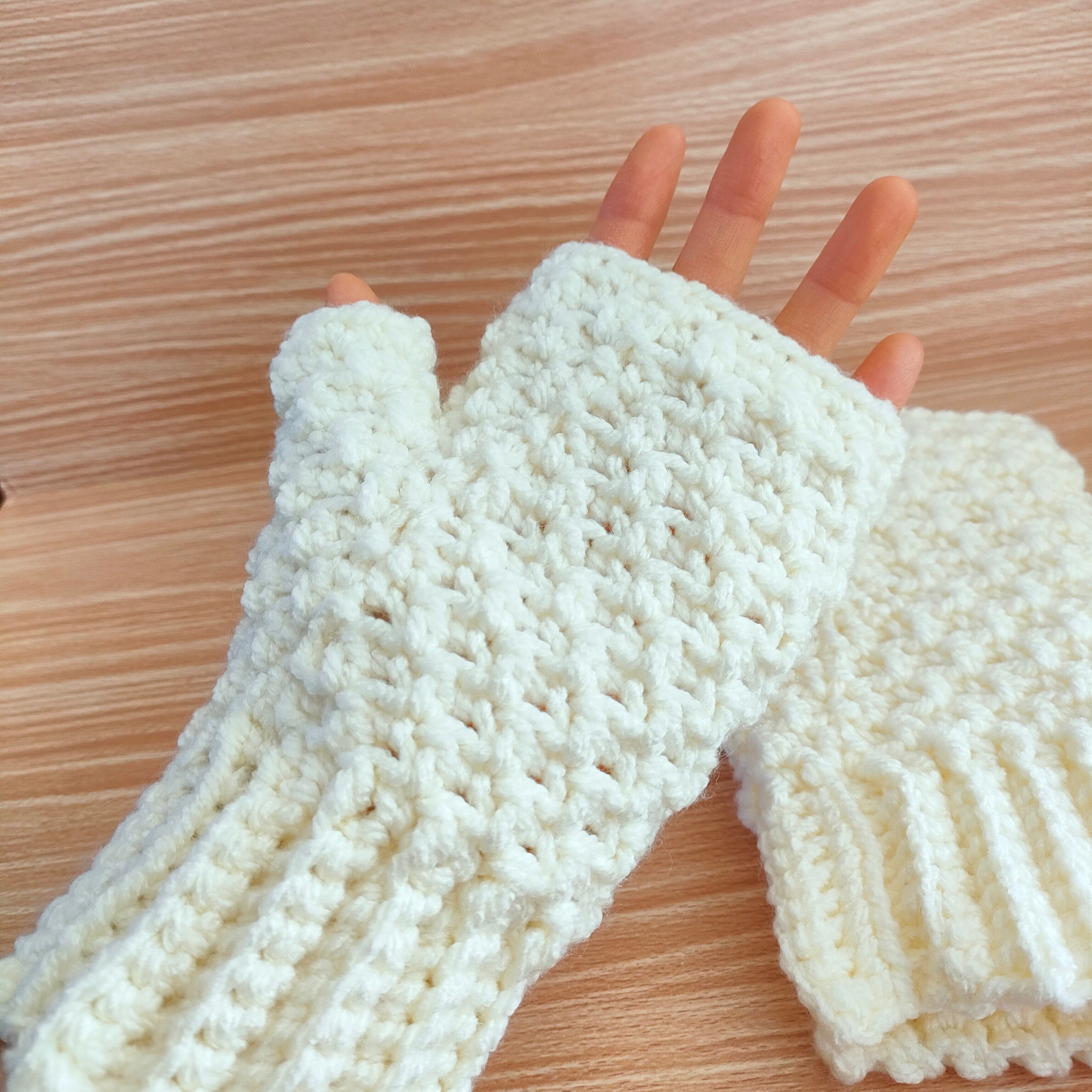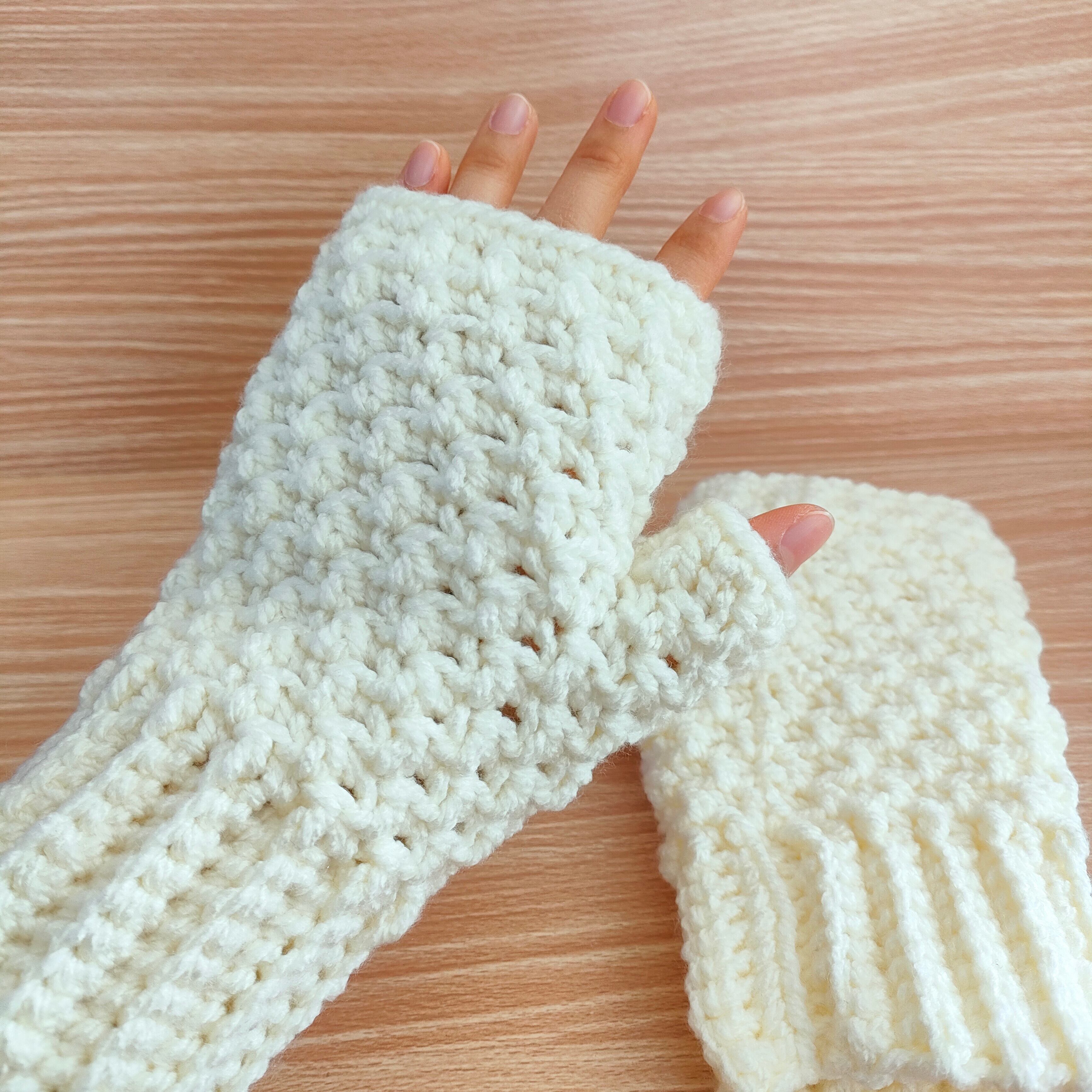 かぎ針でぎゅっと密に編み上げた、極厚仕様のハンドウォーマー。